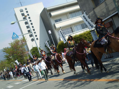 この日のメインは武田二十四将騎馬行列です。一般参加の方々が二十四将となって甲府駅周辺を騎馬で練り歩くというナイスイベントです。愛してる!!