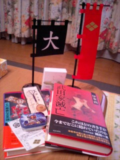 勝頼様の旗印に御館様の旗印に内藤ストラップに武田家当主の説明本に武田滅亡の小説に武田菱のシール(三代目)…あとウラの缶。(何か違うのありますけどー!!)