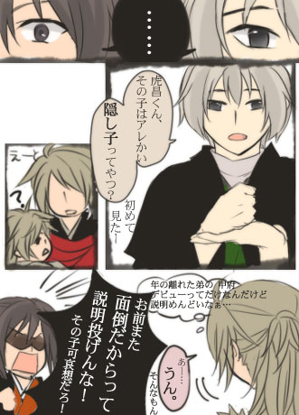 昌澄ー!ありがとうございます!多分この後ダッシュで逃げようとして三枝さんに激突して昌月に捕獲されます。せわしないな昌澄。逃げ弾正の子は逃げるの下手。本当に似たのは見た目だけなのですね。上の描いて手えっらい違和感におそわれたのは気のせいじゃないと思いたい。