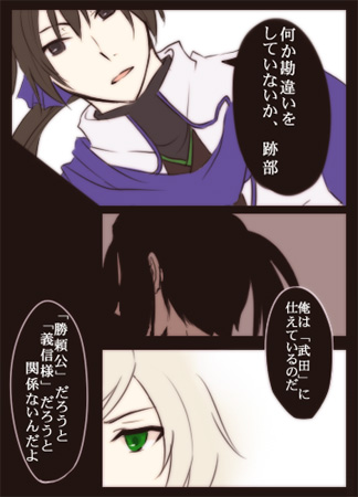 あと、跡部と安倍さんでは見るところ目指すところ思想云々が全然違うので、勝頼様に厳しい二人でも馬はあわないんじゃないかなって思う。逆に勝頼様第一って点で見ると跡部と昌恒が意気投合しそうです。仲悪いけど。自分設定もりもりである。
